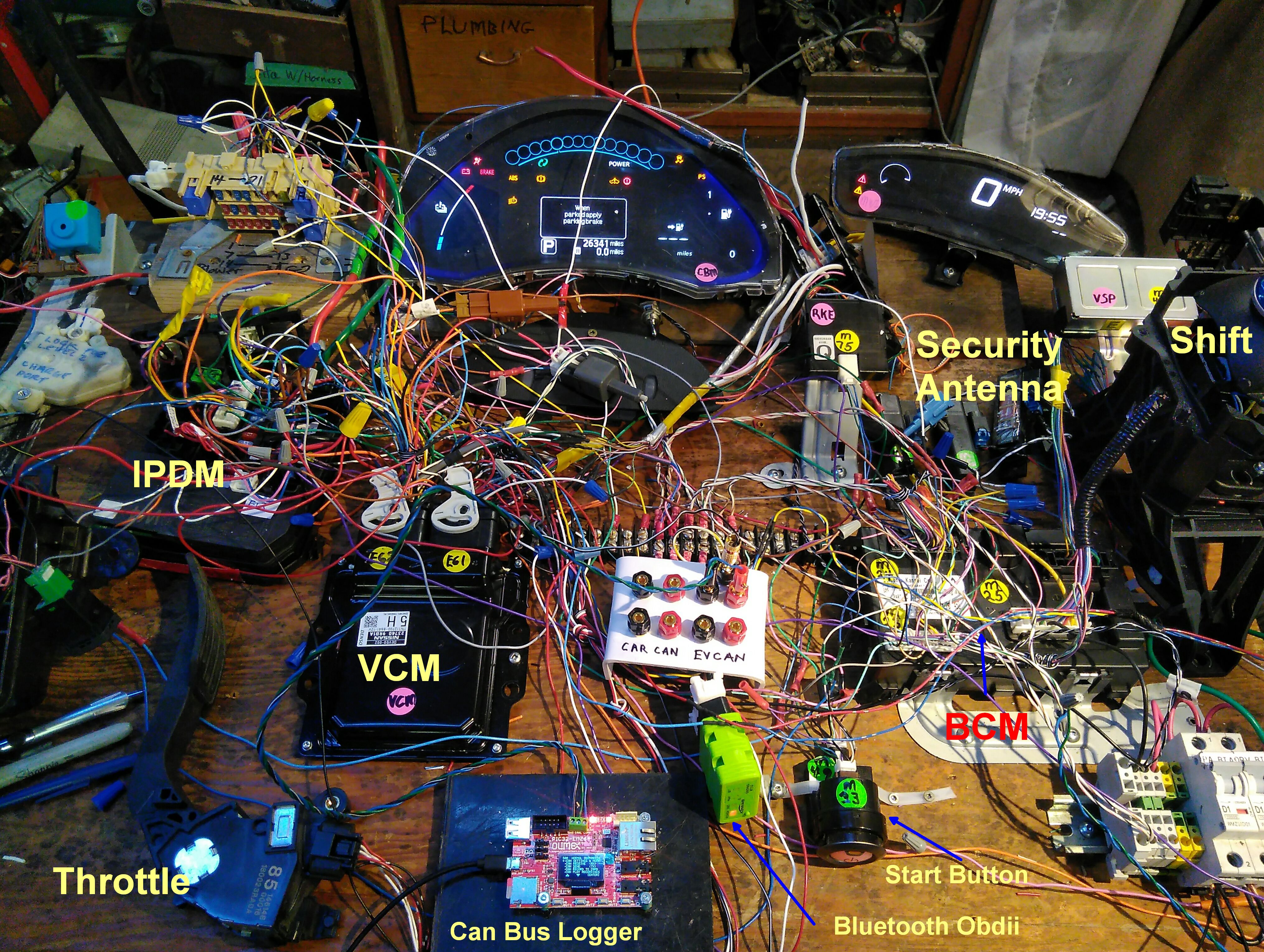 THIS IS AN UNFORMATED REPOSITORY OF INFORMATION FOR KNOWLEDGE EXCHANGE. If you have stumbled across this page and are interested details can be found on the my nissan leaf forum. Some of the older post will not be current. Everything should be questioned, this is a work in progress. If you can help please contribute thru the nissan my leaf forum or send me an email > peter at evmotorworks dot ca Links to code and recording for inserting multiple messages updated August 17/20 CanBus recording This is the results recording on the OBC/PDM side of a can bridge on the EV can bus, during message insertion. can-bridge-firmware.c This the significant part of the code to generate the above recording on an incomplete car pictured above and as diagramed below. can-bridge-firmware.h As above mcp25xx.c As above